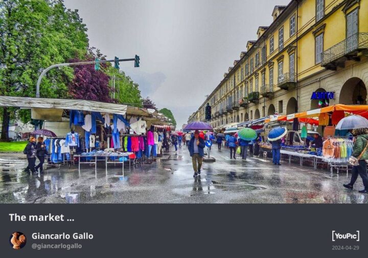 La fotografia riprende un giorno di mercato che si svolge per una strada in una giornata piovosa.